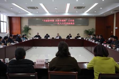 按照市、区“三大一实干”活动总体部署和区“共建新钟楼,共植幸福树”活动具体要求,3月30日下午,区人大常委会开展了“共建新钟楼,共植幸福树”大讨论活动。区人大常委会主任张晓平,副主任吴嘉润、曹卜成、黄勇,区人大常委会办公室、研究室、各工委负责同志以及钟楼区各条战线上的23名区人大代表和专家学者参加了座谈。