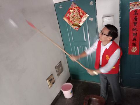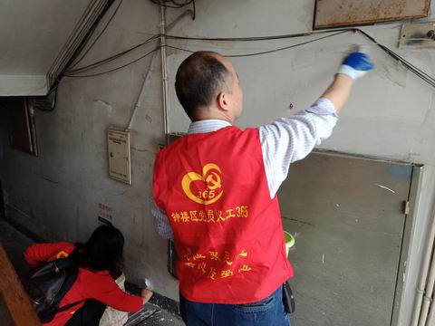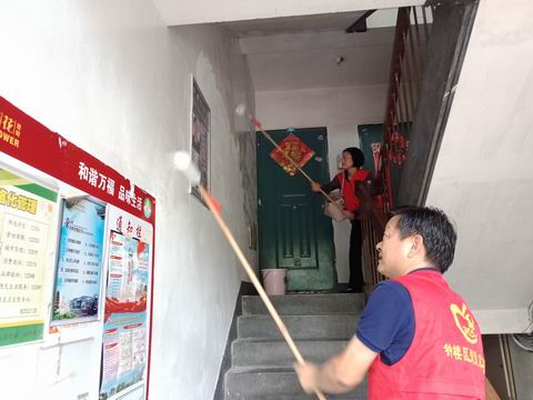 大家来到万福花园小区,对小区的楼道刷新,为居民创造干净美观的居住环境。万福花园小区属于老旧居民小区,人员进出较杂,楼道内四处张贴的违章小广告、墙皮剥落等问题影响楼道环境,极不美观,既影响美感,也影响居民生活。在清理过程中大家先拿刷子清理墙面上的灰尘,再用滚筒蘸着涂料粉刷陈旧、昏暗的墙面,看到涂得不均匀的部位再用滚筒重新刷一遍,墙面瞬间焕然一新。