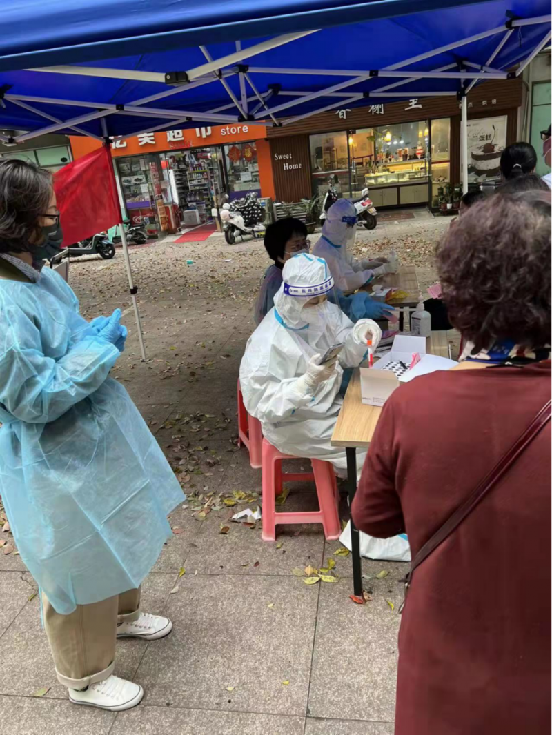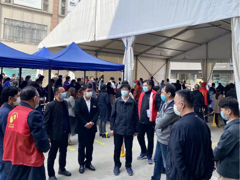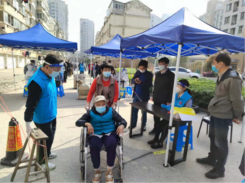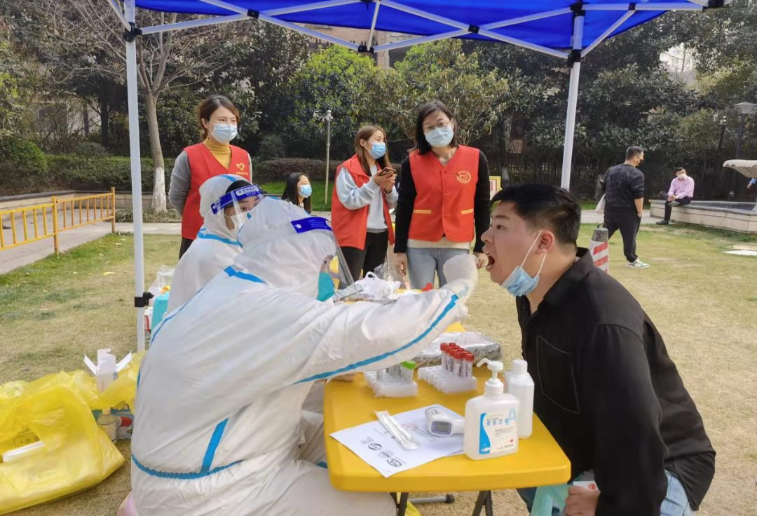 3月16日,区政协委员唐茹玉、张智到荷花池社区采样点,引导居民有序排队,进行核酸检测。