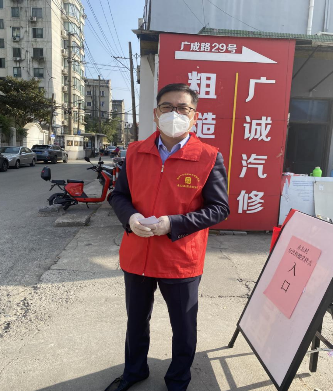 3月16日,区政协委员刘郁春在永红街道永红村委做志愿者,维持秩序。