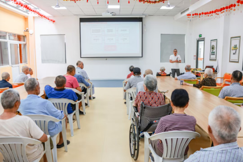 培训紧扣老年人日常生活实际,内容“干货”满满。刘敏勇老师针对老年人常见意外伤害与突发疾病情况,采取了“理论讲解+案例分析”相结合的方式,用浅显易懂的语言,重点讲解了心肺复苏(CPR)的基本流程、跌倒处理、走失预防等实用急救知识。刘老师还结合老年人群体特点,特别强调了在实施急救过程中的注意事项和自我保护措施。“哪怕坐着轮椅,也要来学一学!”玖玖江南康养中心的朱希超院长表示,“以往我们医护人员每月也会进行一次有针对性的应急救护培训,但是老年人直接参与的,这还是第一次,所以大部分老年人很感兴趣,听一听,看一看,学一学,关键时刻能正确处置,说不定就能挽救一条生命!”