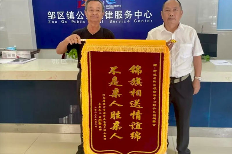 近日,邹区镇综治中心民情工作室调解员姚文东收到了一面跨越数百公里而来的锦旗。锦旗上“锦旗相送情谊绵,不是亲人胜亲人”十四个大字,承载着在外务工的小周深深的谢意。这是他特意委托亲人送来,感谢综治中心调解员为他成功追回被拖欠工资的暖心之举。