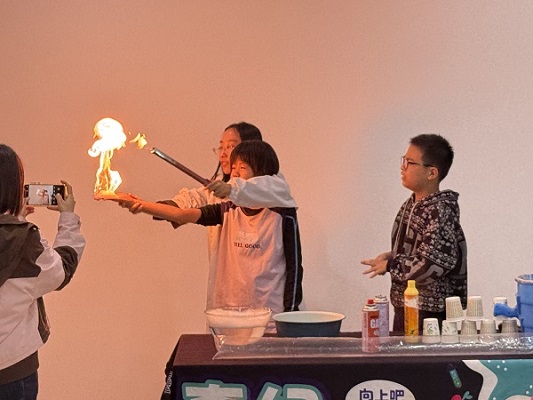 “嘭!”一团火焰在老师掌心骤然绽放,全场瞬间被此起彼伏的“哇塞”声点燃。在泡泡水里加入易燃的丁烷气,水面就会出现很多充盈着丁烷气体的气泡与火焰相遇,会吸收热量快速蒸发,形成冷却保护罩。在老师的引导下,大家将泡泡均匀裹满手掌,轮流试验。“我好像有了控火超能力!”孩子们瞪大双眼,兴奋的叫喊声里满是对科学的好奇与惊叹。
