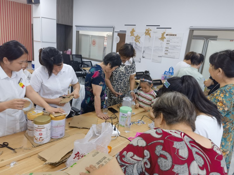 创意DIY,废旧利用,点亮花廊。最后的废旧材料DIY环节,居民们提前收集好家中的废旧奶粉罐、旧纸盒、画笔等材料,在志愿者老师和网格员的指导帮助下,充分发挥自己的创意和想象力,将这些废旧物品变成了精美工艺品。有的居民用颜料在奶粉罐上画出鲜艳的紫荆花,有的用旧纸盒剪出了可爱的动物造型,还有的将奶粉罐组合在一起,制作成了别具一格的装饰品。这些DIY成品将被装饰在小区花廊上,为花廊增添一份独特的魅力,同时也向居民朋友传递了环保和创新理念。
