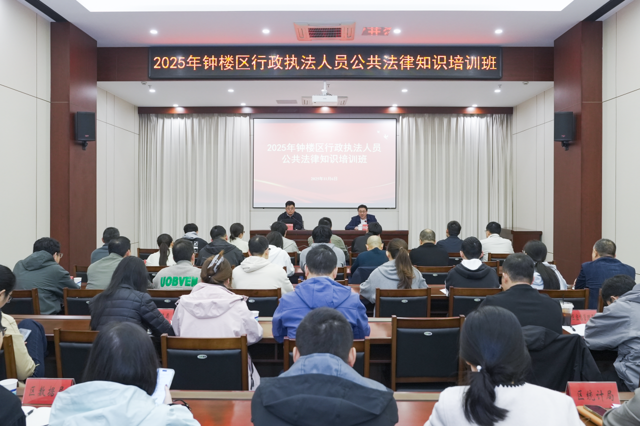 为深入学习贯彻习近平法治思想,全面落实《提升行政执法质量三年行动计划(2023—2025年)》部署要求,切实破解行政执法实践中的突出问题,11月6日至7日,钟楼区2025年行政执法人员公共法律知识培训班成功举办。钟楼区司法局副局长袁波作动员讲话。