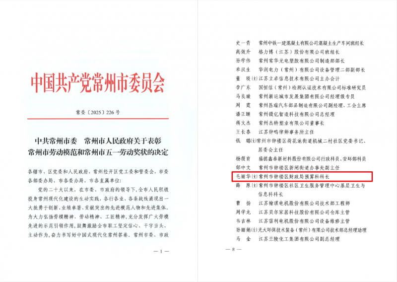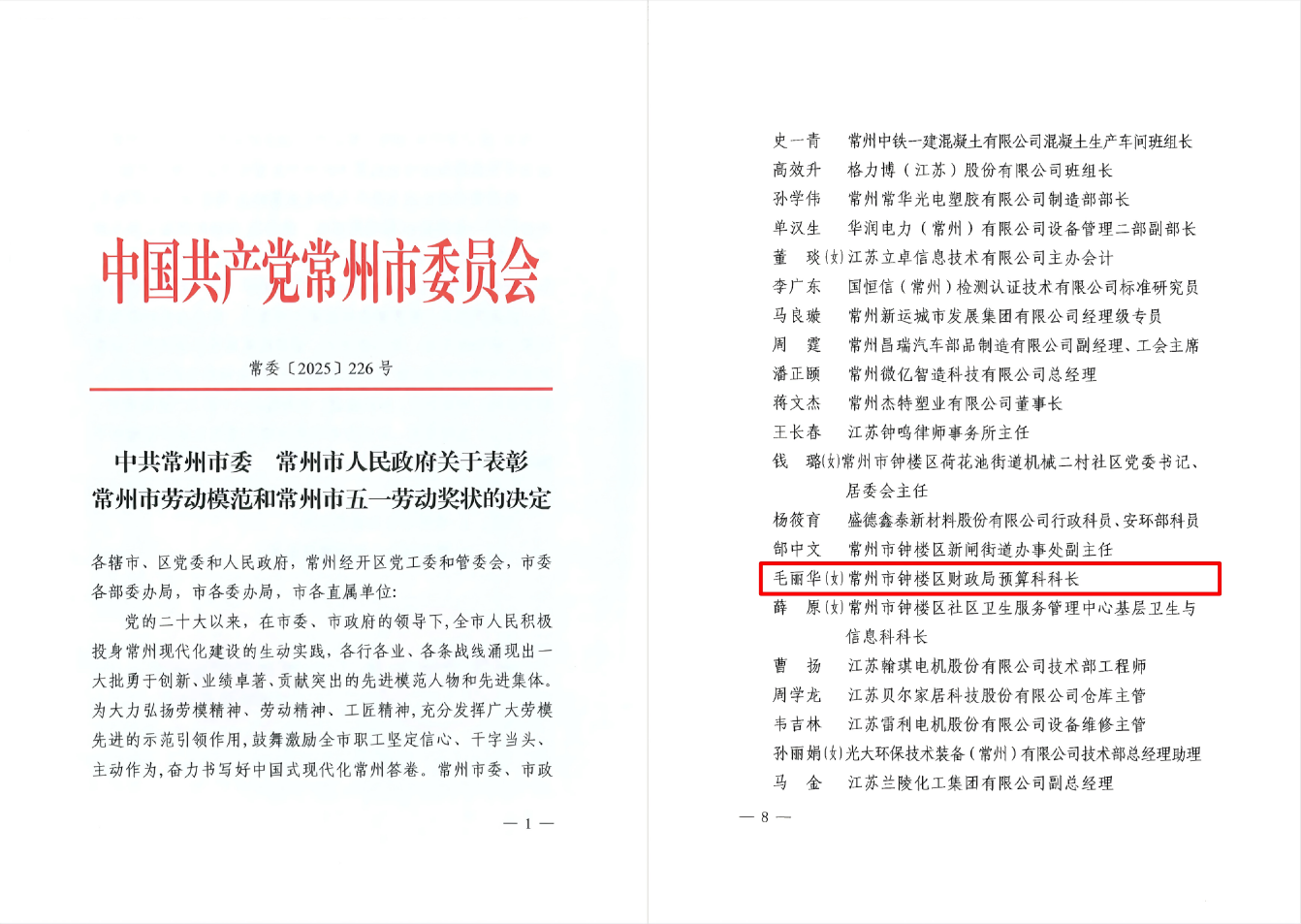 近日,常州市委、市政府发布《关于表彰常州市劳动模范和常州市五一劳动奖状的决定》(常委〔2025〕226号),区财政结算中心副主任毛丽华被授予“常州市劳动模范”荣誉称号。