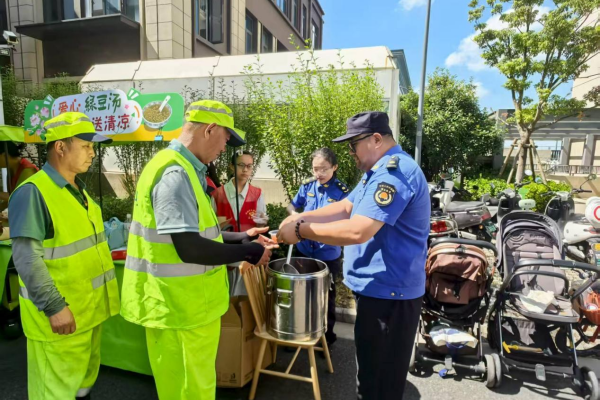 清凉慰问送一线,城市管理显温情。在活动现场,城管队员在门口设立了“夏日送清凉”服务点,为过往的环卫工人、快递小哥等一线劳动者送上精心准备的“清凉礼包”,内含藿香正气水、清凉油、毛巾等防暑用品。同时,现场还熬制了清凉解暑的绿豆汤,供劳动者们免费饮用。炎炎烈日下,这一份份心意传递着城市对户外劳动者的敬意与关怀,让他们真切感受到这座城市的温度。