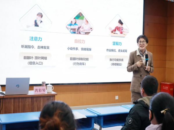 讲座伊始,芮老师首先明确了“专注力”的三个核心,即注意力、自控力和坚毅力,并分别对其进行讲解。例如,分析了“孩子注意力不集中的危害”,包括人际关系紧张、行为习惯不良、自我效能感缺失等等。其次,芮老师针对药物治疗、感统训练、心理训练等专注力训练的方法进行了讲解。接着,芮老师介绍了在家就能练的辅助方法,包括分段作业法、“大声朗读+复述”的阅读方法等,为家长提供了切实可行的实践指导。最后,芮老师指出在此过程中家庭支持也很重要,强调“睡得好,记得牢”“做盟友,非敌人”“扬优势,不揭短”,同时提出“做孩子的‘脑教练’,而不是监工”。