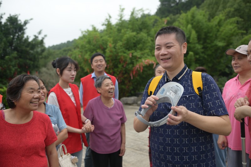 随后,在园区专属导游的爱心讲解下,视障朋友们开启了深度体验之旅。他们循着导游的细致描述,触摸着“二十四孝”雕塑的纹理,感受历史故事中孝亲的温度;在孝道文化展馆内,通过触摸展品、聆听语音讲解,沉浸式了解传统孝道文化的传承与发展;漫步于园区的无障碍步道,平整的路面、清晰的盲道指引,让他们轻松感受微风拂过湖面的惬意与园区绿植的清新气息。活动中,区盲协副主席何文亮还现场介绍科技助盲帽及豆包最新功能(含实时监测、视频通话AI功能),借助科技力量,让视障朋友更便捷地感知周边环境,让“科技助盲” 真正落地于细微之处。