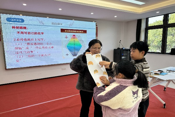活动特别邀请了经验丰富的何雪芬老师组织开展。在“情绪超能力探索站”的暖身环节,青少年积极互动,用夸张的肢体语言演绎喜怒哀惧,让抽象情绪化作具象表达。当凡凡踮起脚尖模仿“骄傲”的姿态时,全场爆发的笑声瞬间点燃了探索热情。随后的“情绪气象站”环节,青少年用水彩笔画绘制个人“情绪温度计”。这种可视化训练打破了青少年对情绪的模糊感知,帮助他们建立精准的情绪识别能力,为后续调节奠定认知基础。“情绪传导接力赛”“能量转化实验室”将场地化作共情能量场。青少年传递“心灵能量球”,通过非言语互动完成情绪理解与支持。当负面情绪卡片被投入“情绪熔炉”时,青少年通过角色扮演、正向宣言等方式重构认知,实现从被动承受情绪到主动掌控情绪的跨越。“情绪彩虹桥”将活动推向高潮。现场以“考试失利”这一贴近青少年的情境展开,何老师先引导青少年静心觉察焦虑、沮丧、自责等情绪,接着鼓励他们拿起画笔用文字或绘画把内心情绪具象化,让情绪怪兽“现形”。随后通过小组讨论和正向引导,青少年明白了考试失利是成长小插曲,负面情绪是身体提醒调整学习与心态的信号,进而积极思考应对策略。何老师带领大家放松训练,感受身体放松与内心平静,进行积极自我暗示活动,大声表达和鼓励自己。在后续的交流分享中,有的青少年坦诚倾诉考试失利带来的巨大压力,同时也坚定地表达出努力学习、下次取得进步的决心;有的则绘声绘色地分享与朋友倾诉的过程,将内心的烦恼毫无保留地倒出来,在朋友的安慰与鼓励中,收获温暖与力量,也更加珍惜这份真挚的友谊。