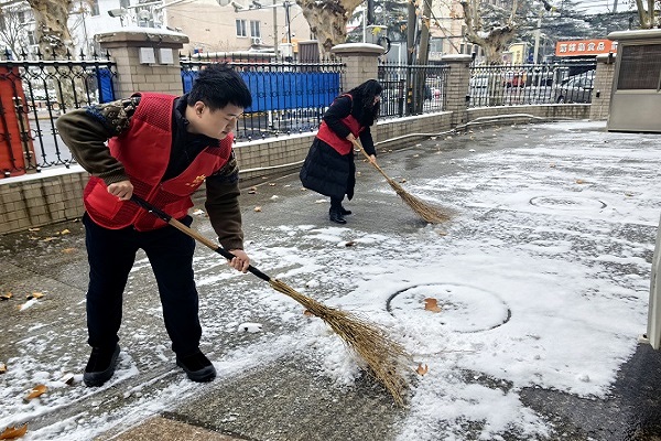 前进村(社区)新时代文明实践站志愿服务队践行志愿服务精神,让“志愿红”成为雪天里最亮眼的风景,以实际行动筑牢社区安全防线。(常思远)