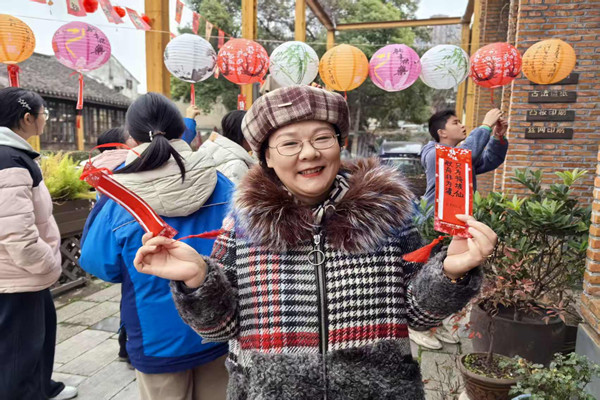 今年的灯谜不仅考验智慧,更藏着“常州文化地图”。村社特邀本地文化学者设计谜题,从“文笔塔”到“淹城遗址”,从“常州评话”到“银丝面”,让居民在欢笑声中解锁家乡记忆。“以前觉得元宵灯谜老套,现在结合本地元素,连孩子都追着问‘常州还有哪些宝贝’!”一名家长笑着说。