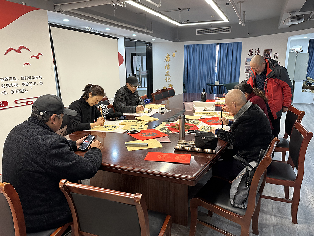 书法班的志愿者陆老师怀着对廉洁文化的深厚敬意,提前数日就开始精心筹备,他不仅亲自挑选了富有廉洁寓意的对联内容,还一笔一画用心书写,确保每一副春联都字迹工整、意蕴深远。这些春联不仅传递了廉洁自律的价值观念,更承载着对社区工作者们勤政为民、清正履职的真诚赞美。陆老师亲手将春联送到每一位社区工作人员手中,并亲切地与他们交流,表达对他们一年来辛勤付出的感谢,同时也送上诚挚的新春祝福和美好愿景。
