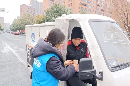 在凛冽的寒风中,社区的暖心服务也同步展开。志愿者们提前精心熬制了驱寒姜茶,并在小区门口、便民驿站设立了服务点,为那些在雪中奔波的快递员、外卖员和环卫工人等户外劳动者、新业态群体递上温暖的热饮。