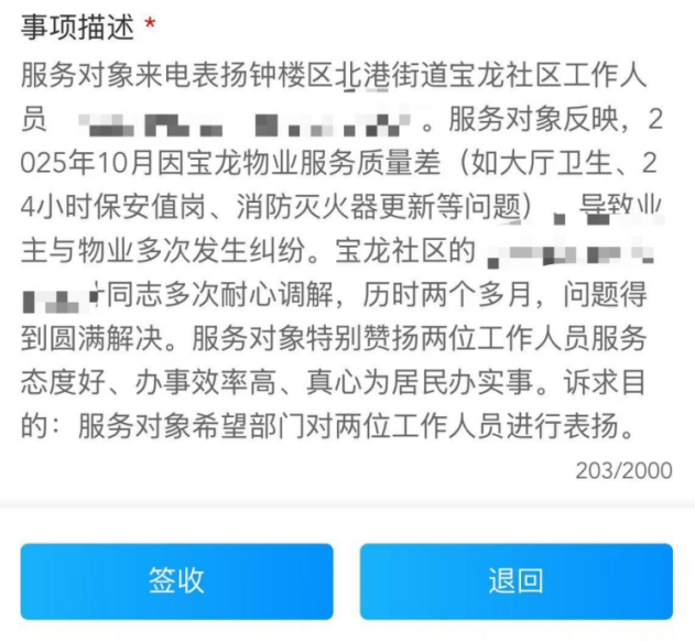 这份坚持与担当,被服务对象看在眼里、记在心里。近日,一位市民特意通过12345政务服务热线打来表扬电话,对社区工作表示高度赞扬。来电中,市民提到,两位社区工作者不仅服务态度好、办事效率高,更重要的是真心为居民办实事,用耐心和专业化解了邻里矛盾,让小区恢复了和谐。
