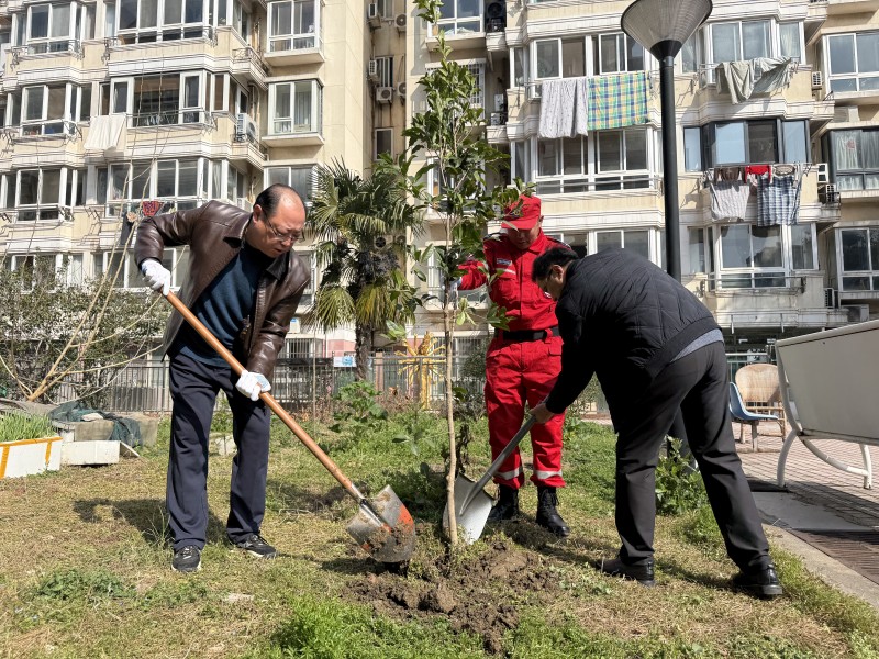 活动现场,每一位党员同志及红十字志愿者分工协作、配合有序。挥锹挖土、扶苗填坑、浇水灌溉,每一道工序都认真细致、一丝不苟。经过大家的共同努力,15株小树苗在社区空地上“扎根落户”。汗水沁出额头,泥土沾满衣襟,但回望那片亲手种下的新绿,每个人的脸上都洋溢着满足与快乐。