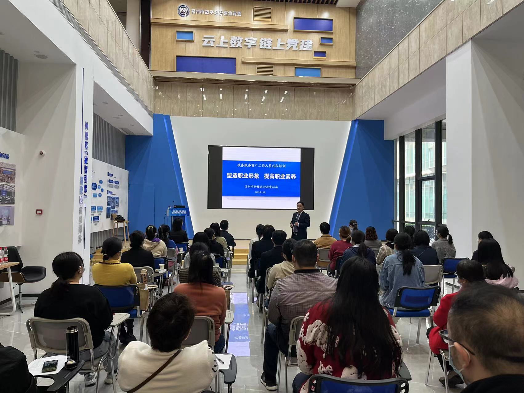 本次培训邀请了常州信息职业技术学院招生就业处副处长窦凯带来培训第一课——政务礼仪和窗口接待礼仪。窦凯结合窗口实际工作,重点从政府窗口服务人员职业形象塑造、常用礼仪规范、语言礼仪及基本接待流程等方面进行讲解,指导培训人员如何在工作中正确运用,以提高工作人员个人服务水平,提升企业、群众满意度。