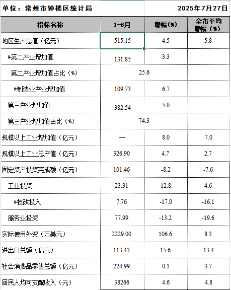 钟楼区2025年1-6月份主要指标完成情况(图表)