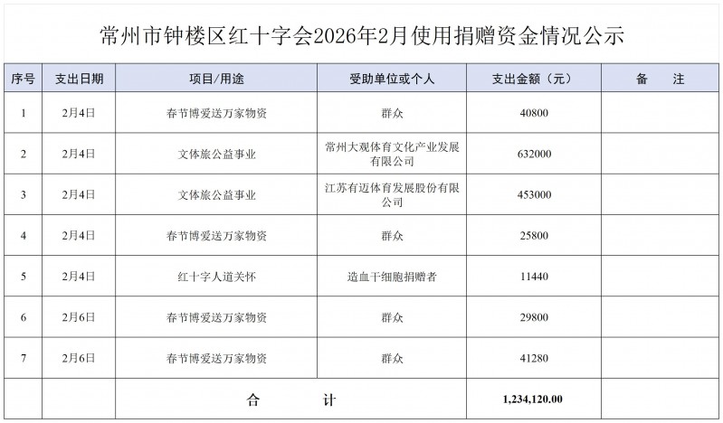 2026年2月常州市钟楼区红十字会捐赠收支明细